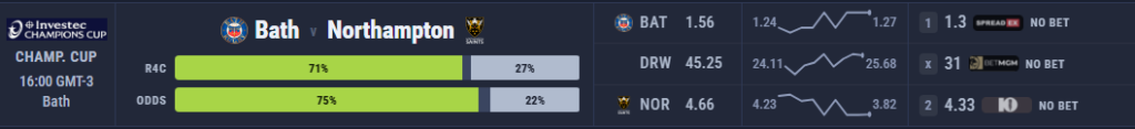 Looking at the market for this game, there is not much value as the bookies seem to have priced it fairly accurately. They give Bath a slightly higher chance of victory, but it is marginal, so maybe one to watch is Northampton, but look for anything at 4.66 and above for value.