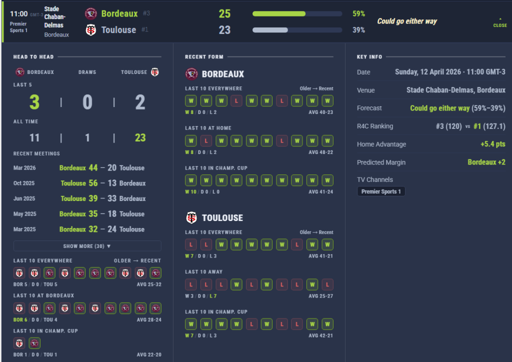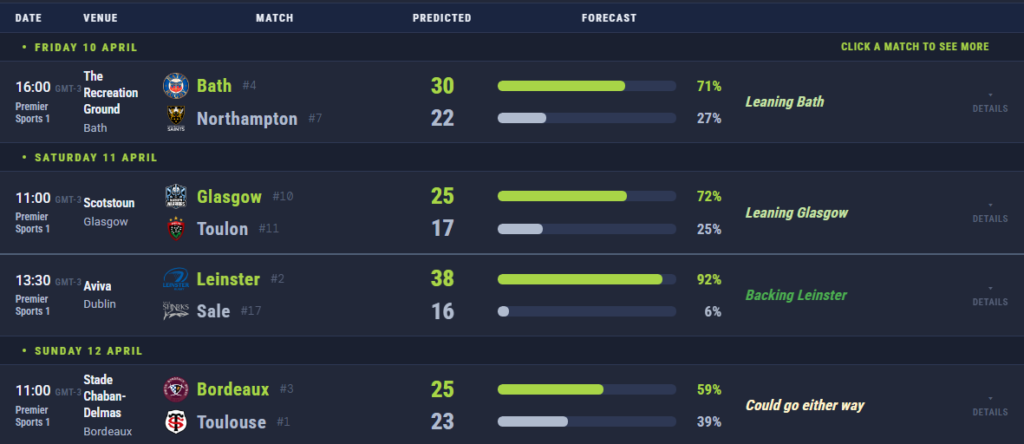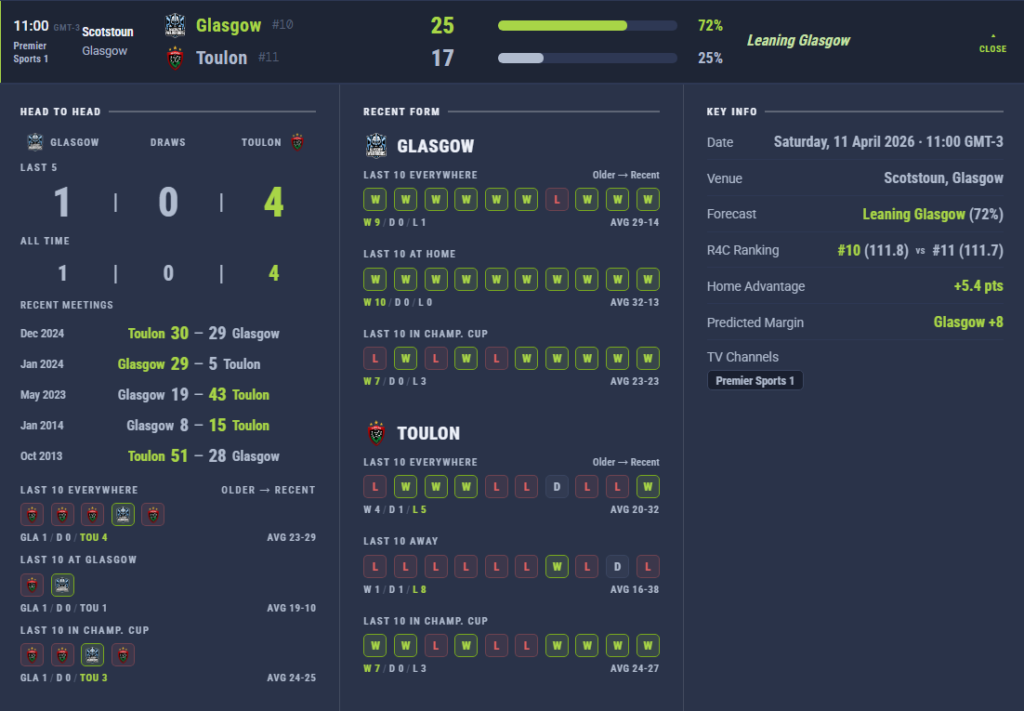On Saturday afternoon, we have Glasgow at home to Toulon in what should be another close match. We have Glasgow as slight favourites with a predicted scoreline of 25 points to 17, Glasgow with a 72% chance of victory and Toulon at 25%. Both teams sit at number 10 and number 11 in the current rankings, so both are fairly outside contenders for the overall title. In their last five matches, Toulon have won four, with Glasgow’s only victory coming in January 2024. However, Glasgow have won all 10 of their last 10 matches at home, and Toulon have won just once in their last 10 away matches. So it looks quite possibly like a Glasgow victory here, although do not be surprised if it is close.