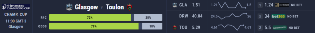 Looking at the markets, it is a similar story, with the bookies pricing it fairly accurately and giving Glasgow a marginally bigger chance. So again, there could potentially be value on Toulon, and look out for anything above 5.29.