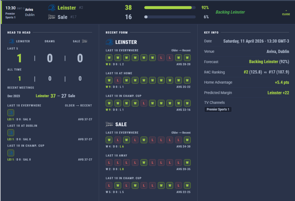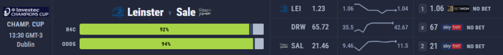 On Saturday afternoon, the third of the four quarter-finals sees what will be the most one-sided game of the round, with Leinster taking on Sale at home. We have Leinster at a 92% chance of success, which is about as high as it gets at this stage of a major tournament, with Sale having only a 6% chance, so we are heavily backing Leinster. Leinster at home, have won their last eight in a row and nine out of their last 10 matches in the Champions Cup. Sale, away from home across all competitions, have won just four of their last 10. It is simply a one-sided game. Leinster are our second favourites to win the tournament outright, so do not expect a close contest. In terms of betting, the bookies and the model are fairly well aligned and there is no value to be found here.