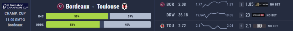 We have Bordeaux at a 59% chance of victory with a predicted scoreline of 25 – 23, which really does highlight what a coin toss this is. The bookies have it even tighter, at 51% Bordeaux and 45% Toulouse, so given we give Bordeaux a 59% chance, there is possible value there. Look out for anything above 2.08.