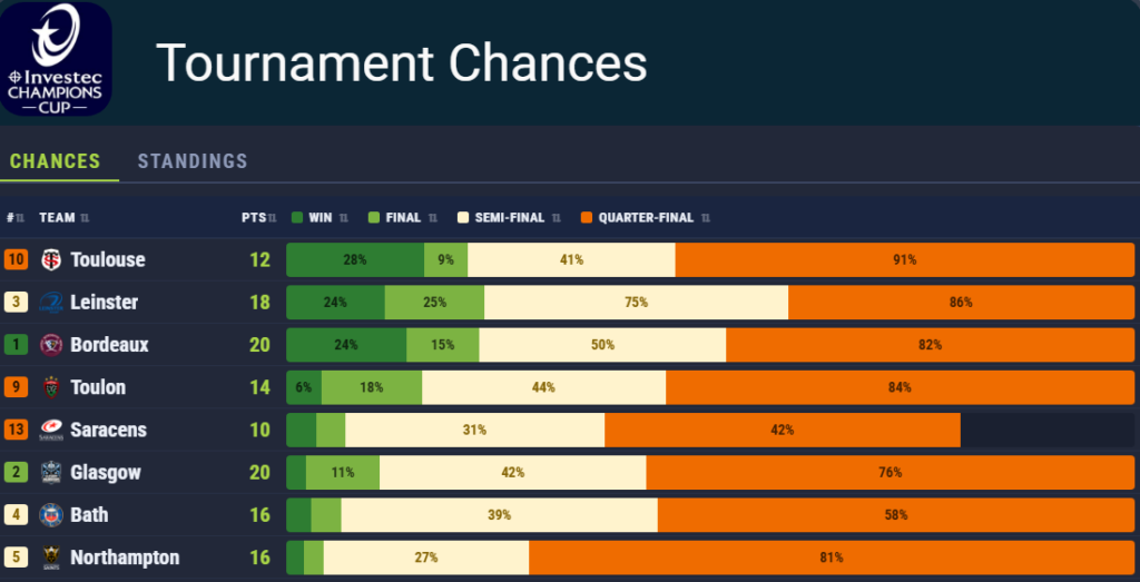Looking at the overall tournament picture, Toulouse lead the way with a 28% chance of lifting the trophy despite being seeded tenth, a reflection of both their Top 14 dominance and their pedigree in this competition. Leinster and Bordeaux are locked together at 24% each, making those three the clear frontrunners. What is particularly interesting is that Bordeaux and Toulouse, two of the three title favourites, face each other this weekend, meaning one of those 24% chances is eliminated before the semi-finals are even reached. Leinster, by contrast, have the most favourable path this weekend against Sale and will be expected to advance comfortably. Toulon sit at 6% and Glasgow at 11%, so while both are capable of causing upsets, the model considers them unlikely to go the distance. Bath and Northampton, the two English clubs meeting on Friday night, both have genuine semi-final ambitions but their chances of winning the tournament outright are slim according to the model. In short, this weekend’s draw has done the competition a favour by serving up what is in all likelihood a final preview at the quarter-final stage, and whoever emerges from Bordeaux on Saturday night will carry genuine title winning momentum into the semi-finals.