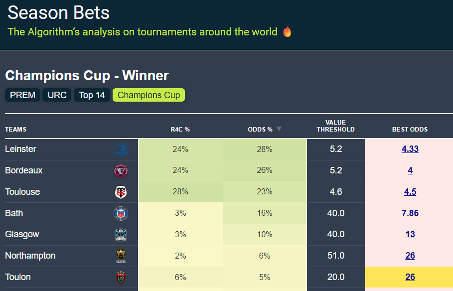 Similarly to the actual quarter-finals, there is no real value in the outright winner market either, with all teams being fairly accurately priced. One to look out for is Toulouse as if they get past Bordeaux those odds will come tumbling down. Value above 4.6 currently.