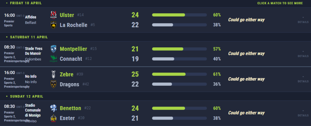 The second tier Challenge Cup is where the most evenly contested action of the weekend may well be found, with all four quarter-finals genuinely too close to call. On Friday night, Ulster host La Rochelle in what promises to be a tight affair, before Saturday brings Montpellier against Connacht, another match that could comfortably go either way. Also on Saturday, Zebre host Dragons with home advantage providing a marginal edge. Sunday rounds out the quarter-finals with Benetton hosting Exeter. Across all four fixtures the model sees very little to separate the teams, making the Challenge Cup this weekend arguably the more unpredictable and entertaining watch.