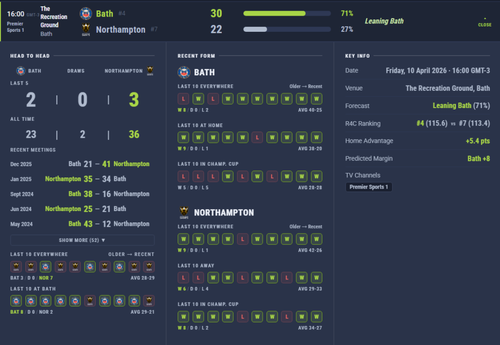 The quarter-final action starts on Friday night with the all-English affair as Bath take on Northampton at home. Bath and Northampton are battling towards the top of the table and are the leading favourites to take the Premiership title, so this is the best that England has to offer. With Bath being at home, we are leaning towards a Bath victory, although Northampton do have a strong chance at 27%. Still, we consider Bath favourites, with a 30 points to 22 predicted margin. Last weekend, Bath reached the quarter-finals by beating Saracens 31 points to 22 in a healthy victory, although it was closer than a previous recent fixture in the Prem. Still, it was a good victory. Northampton had a closer than expected run in at home to Castres, where they came out victors 49 points to 41 in an entertaining match. It should be a very good game. As always, all eyes will be on Henry Pollock and Finn Russell to ignite proceedings, and we predict that Bath will come out on top.